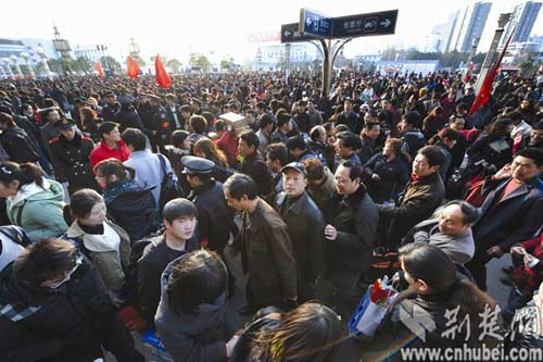 記者今天上午在武昌站采訪了值班站長,她告訴記者,去年春運(yùn),買票的隊(duì)伍成了長龍,要蜿蜒拐彎延伸到廣場上,而現(xiàn)在售票窗口前,排隊(duì)的人大多在二三十人左右。她兩相比對,感嘆還是高鐵緩解壓力。