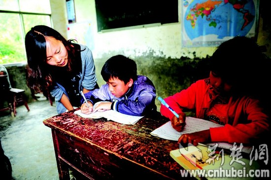 圖為:張春麗再次走進(jìn)課堂,輔導(dǎo)孩子們語文。